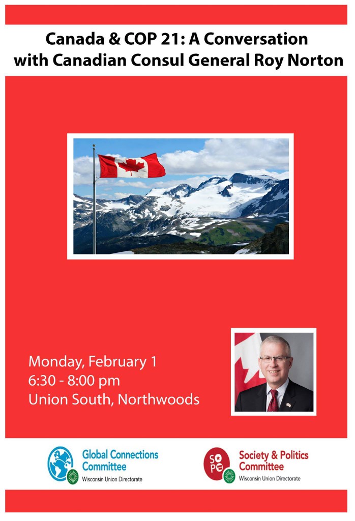 Following recent climate talks, students are eager to participate in conversation about the subject. A student organized event, we invite you to join the Global Connections Committee and Society and Politics Committee with Canadian Consul General Roy Norton in a conversation about COP 21.