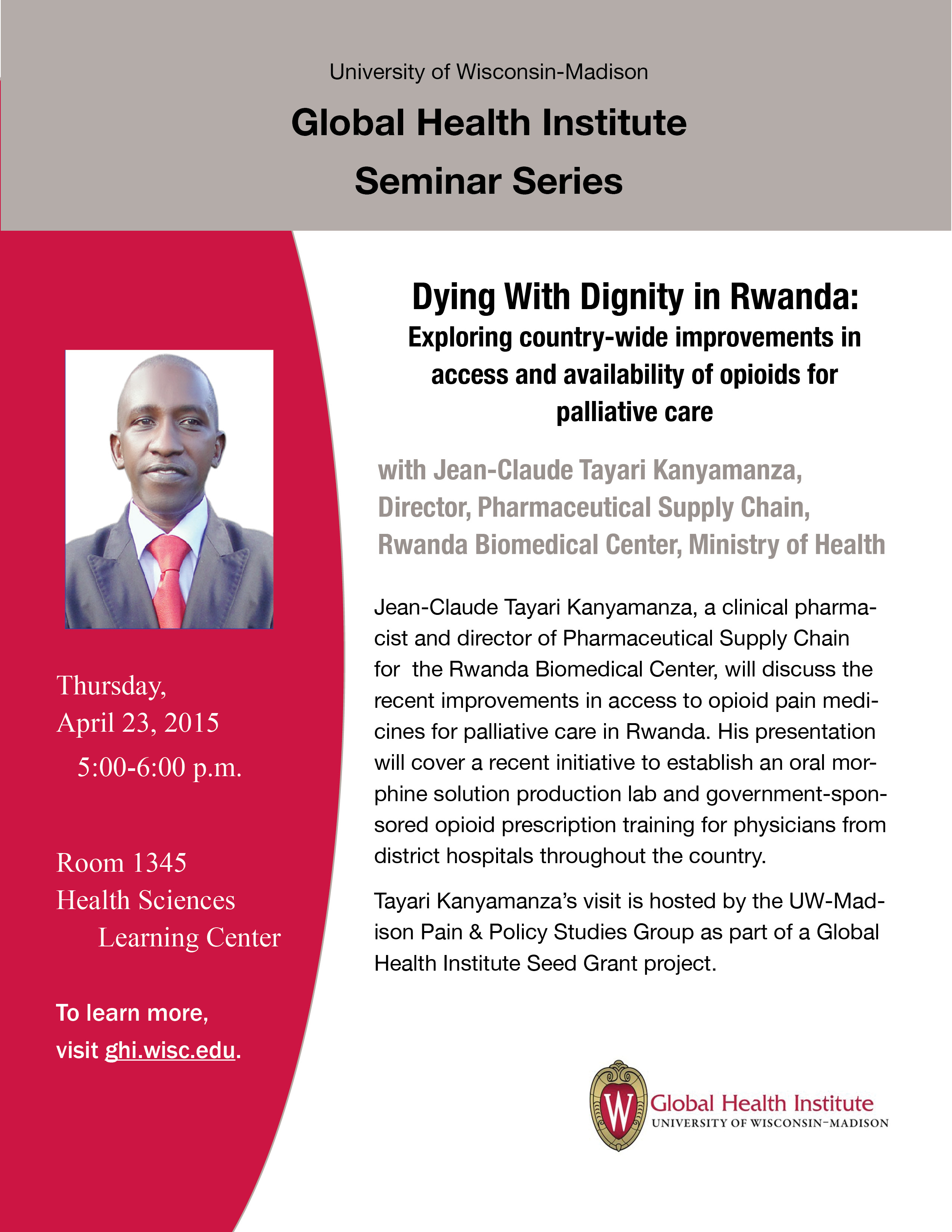 Tayari Kanyamanza holds a masters degree in Public Health and is a doctoral candidate working with the Pain & Policy Studies Group at the Unviersity of Wisconsin-Madison. His visit is part of a Seed Grant awarded by the UW-Madison Global Health Institute.