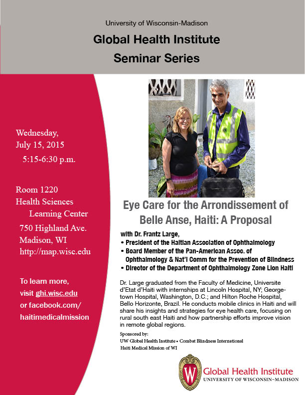 Join Dr. Frantz Large in a discussion for eye health care in Haiti and around the world on July 15. Large conducts mobile clinics in Haiti and will share his insights and strategies for eye health care, focusing on S.E. Haiti and how partnership efforts improve vision in remote global regions.