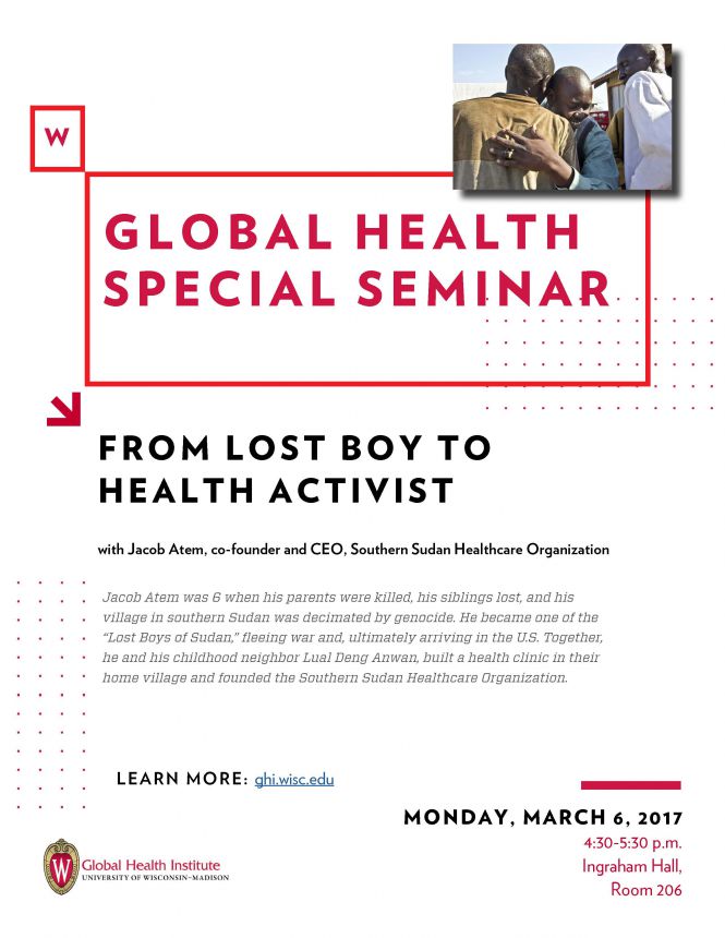 Jacob Atem will share his journey from a genocide survivor to health activist in his home village.
