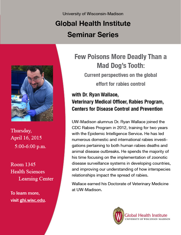 UW-Madison alumnus Dr. Ryan Wallace, a veterinary epidemiologist with the Centers for Disease Control and Prevention, will discuss his work with rabies control around the world. His talk is “Few Poisons More Deadly Than a Mad Dog’s Tooth: Current perspectives on the global effort for rabies control.”