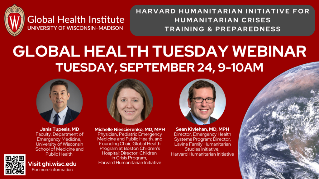We welcome you to join us for GHI’s next Global Health Tuesday Webinar on Tuesday, September 24, 2024, from 9-10am (CST), when UW–Madison Global Health Institute Advisory Committee Member Janis Tupesis moderates a timely conversation with the Harvard Humanitarian Initiative for Humanitarian Crises Training & Preparedness.