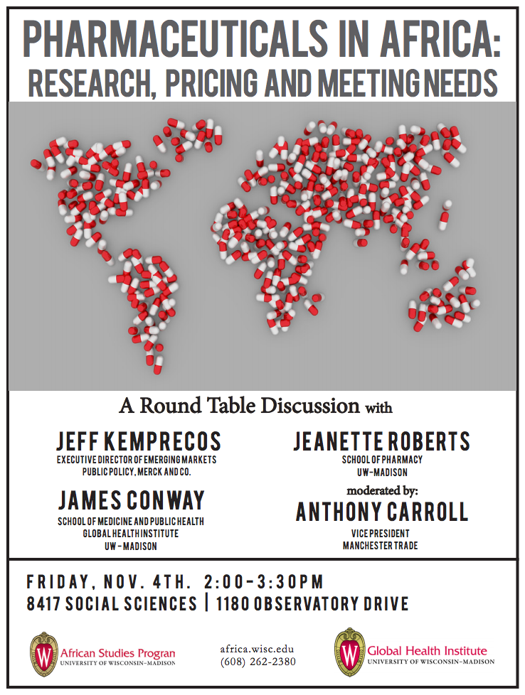 Join ASP and the UW Global Health Institute for a round table discussion on “Pharmaceuticals in Africa: Research, Pricing and Meeting Needs.” The Vice President of Manchester Trade, Anthony Carroll, will be moderating the discussion. Speakers will include Jeff Kemprecos, the Executive Director of Emerging Markets Public Policy of Merck and Co; Jeanette Roberts, School of Pharmacy, UW-Madison; and James Conway, School of Medicine and Public Health, Global Health Institute, UW-Madison.