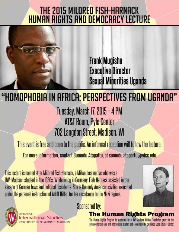 THIS EVENT HAS BEEN CANCELLED: Frank Mugisha, executive director of Sexual Minorities Uganda presents the 2015 Mildred Fish-Harnack Human Rights and Democracy Lecture on the struggles of sexual minorities in the dangerousy hostile climate of East Africa.