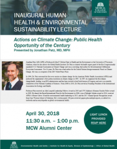 Patz received an Aldo Leopold Leadership Fellows Award in 2005 and UW-Madison’s Romnes Faculty Fellow award in 2009. He shared the Zayed International Prize for the Environment in 2006, won a Fulbright Scholar award in 2014, received APHA’s Homer Calver Award for environmental health leadership in 2015, and the 2017 Alumni Special Recognition award from Case Western School of Medicine. He’s written nearly 100 peer-reviewed papers plus multiple reports, co-edited two textbooks and an encyclopedia on global environmental health.