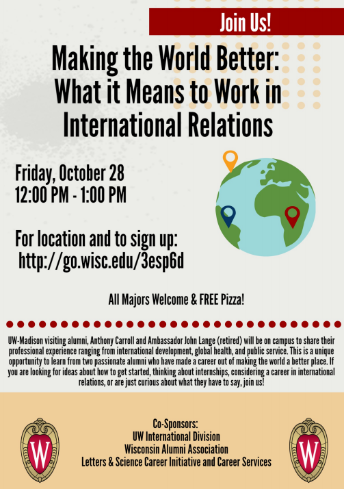 UW-Madison visiting alumni, Anthony Carroll and Ambassador John Lange (retired) will be on campus to share their professional experience ranging from international development, global health, and public service. This is a unique opportunity to learn from two passionate alumni who have made a career out of making the world a better place. If you are looking for ideas about how to get started, thinking about internships, considering a career in international relations, this is a good place to start.