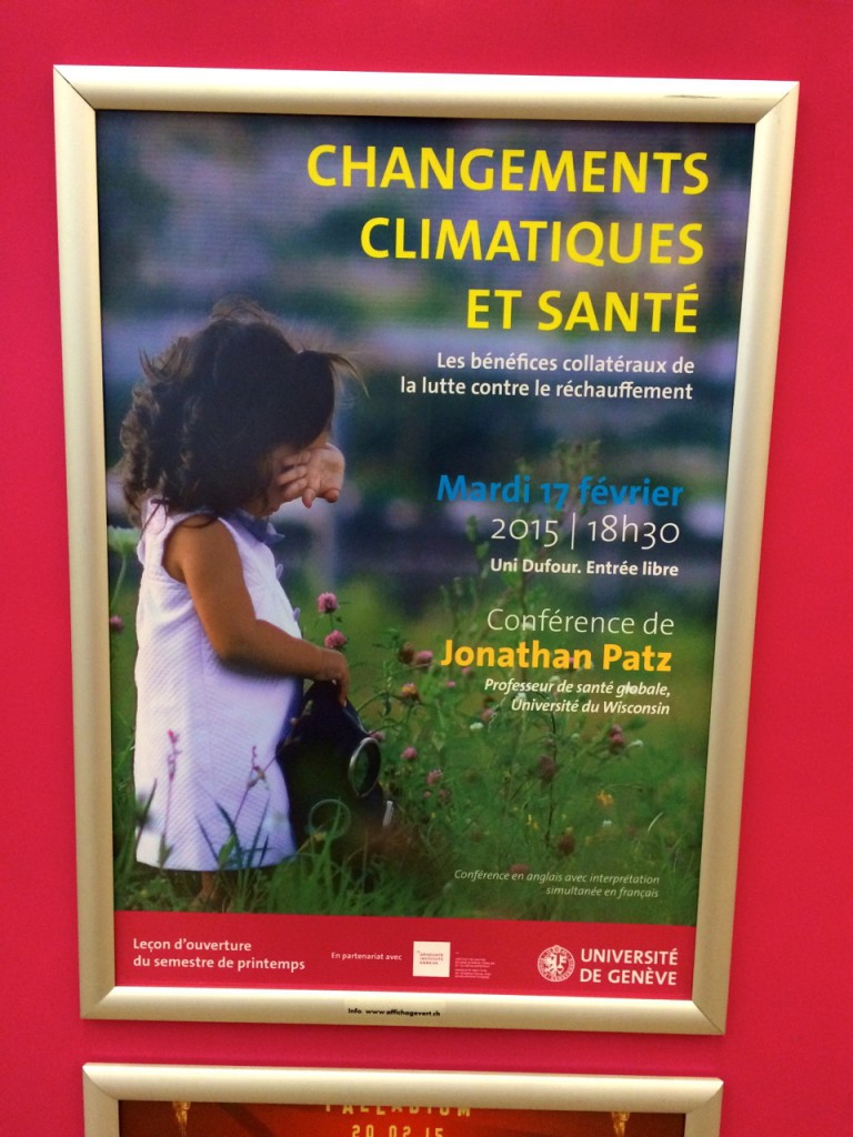 Jonathan Patz. director of the Global Health Institute at the University of Wisconsin-Madison, spent the first months of his 2014-2015 sabbatical in Geneva as a visiting faculty chair at the University of Geneva, faculty fellow at the Graduate Institute of International and Development Studies and visiting intern at the World Health Organization. He gave the semester opening address, “Climate Change and Health” at the University of Geneva in February. The lecture explores how implementing measures against global warming could have positive, concrete consequences for public health. Listen here in French or English.