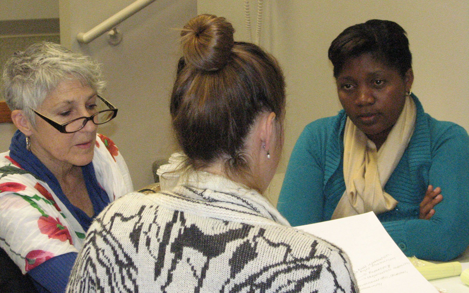 From left, Judy Anderson, executive director of ACT for Congo, UW-Madison graduate student Allison Sambo and Modestine Etoy from DR Congo wrestle with how to better empower girls and women.