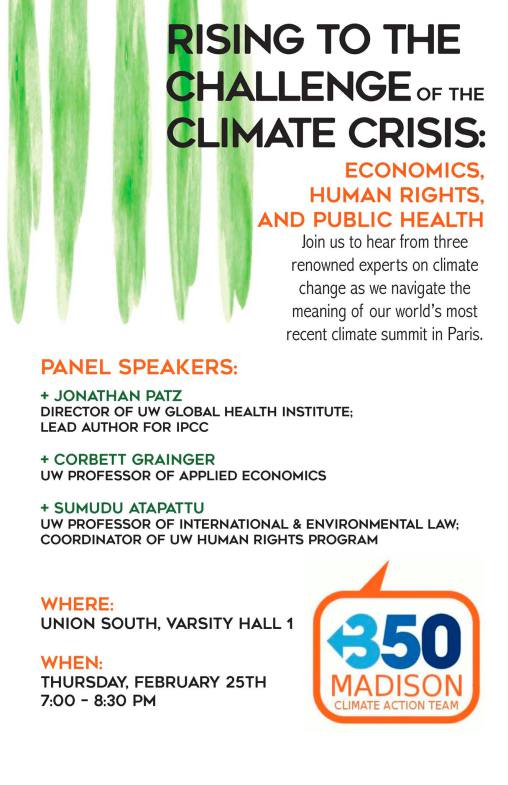 Rising to the Challenge of the Climate Crisis: Economics, Human Rights, and Public Health February 25, 2016 For more information about this event, visit 350 Madison’s website. Post navigation << previous postnext post >>