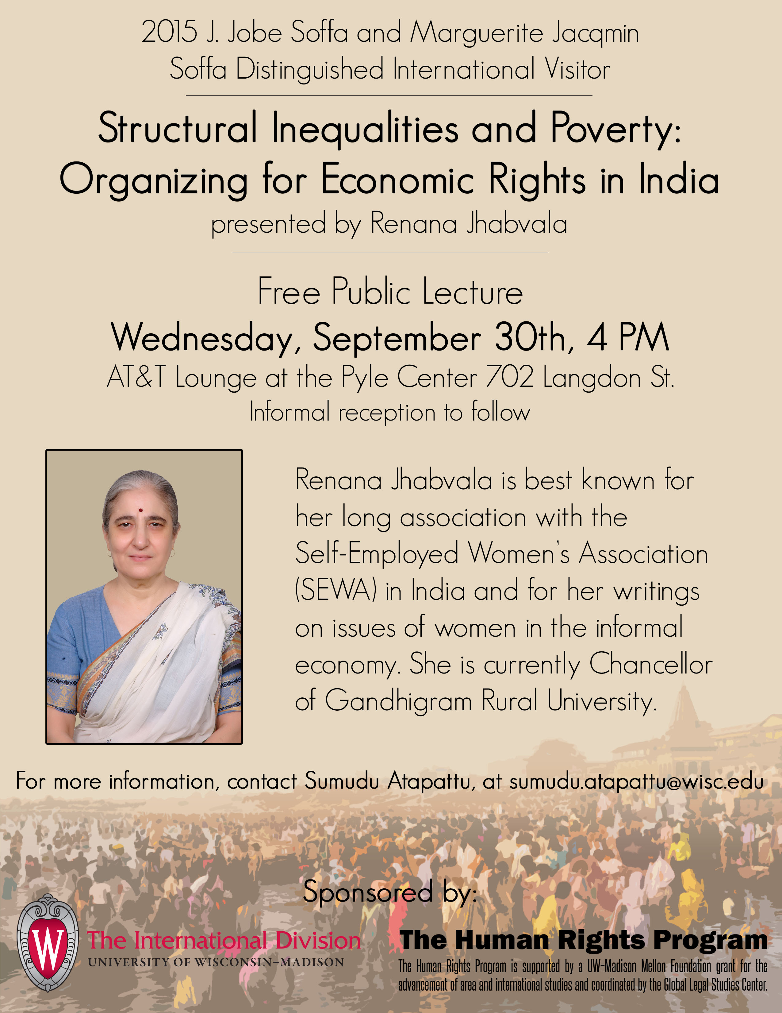 Jhabvala, who has been extensively involved in policy issues regarding poor women and the informal economy in India, will discuss “Structural Inequalities and Poverty: Organizing for Economic Rights in India,” on September 30, at 4 p.m. in the AT&T Lounge at the Pyle Center, 702 Langdon St., on the UW–Madison campus.