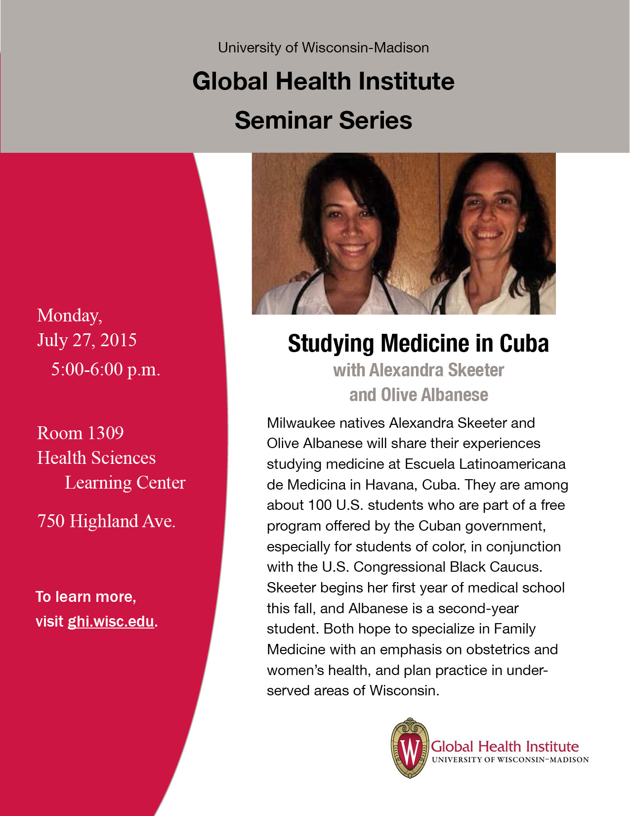 Milwaukee natives Alexandra Skeeter and Olive Albanese will share their experiences studying medicine at Escuela Latinoamericana de Medicina in Havana, Cuba. They are among about 100 U.S. students who are part of a free program offered by the Cuban government especially for students of color, in conjunction with the U.S. Congressional Black Caucus. The program includes students from across the hemisphere and is open to students who agree to work as physicians in underserved communities in their home countries.