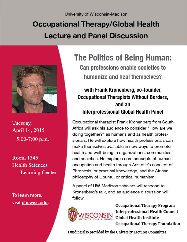 Activist, author and occupational therapist Frank Kronenberg from South Africa will open his UW-Madison talk by engaging the audience around the core question of “How are we doing together—as humanity and as health professionals.” He asks: “If caring deeply about humanity is to be the shared heartbeat of all health professionals, can we then afford to not position ourselves, our discourses and practices politically, historically and critically?